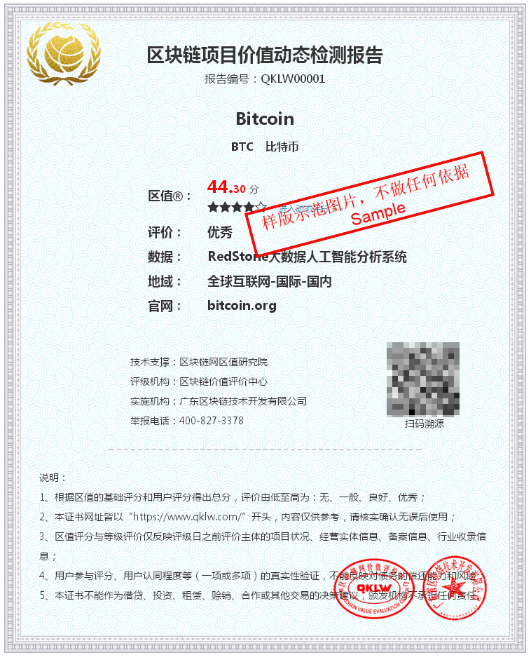 市場上很多的檢測報告都是一張紙幾句話,有些甚至連檢測報告都沒有,直接就發了證書,這真有點像賣假文憑的。區值認證的檢測報告是通過RedStone區塊鏈價值動態檢測系統出具的,不單有上千個檢測項目的明細分值,還有評分的依據和歷史記錄。